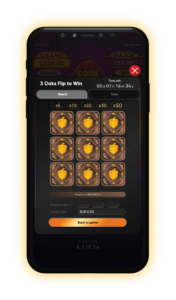 Flip to Win is a fast-paced feature that guarantees rewards! Players simply fill the Progress Bar by making same-bet spins. Once the bar is full, you'll land a flip and receive a guaranteed prize.Then, it's back to the main game to repeat the process and complete the exciting three-flip cycle.